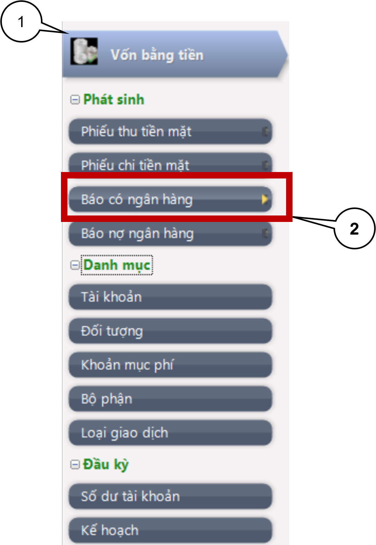 Bước 1: Vào phân hệ Vốn bằng tiền, chọn Báo có ngân hàng ( hoặc vào Chứng từ \Báo có ngân hàng).