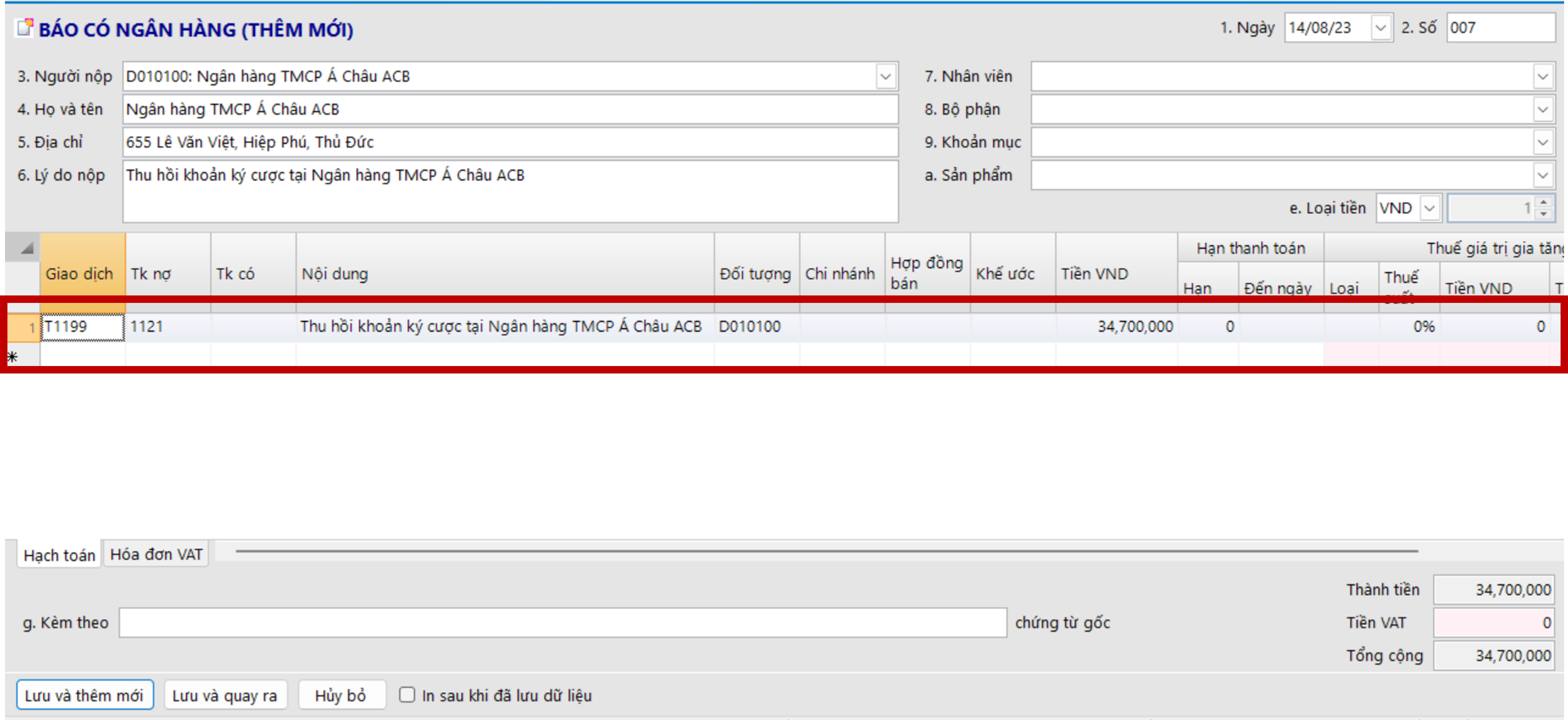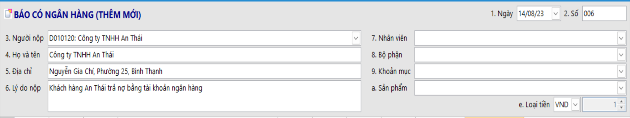 Bước 2: Khai báo các thông tin chi tiết của phiếu báo có ngân hàng: