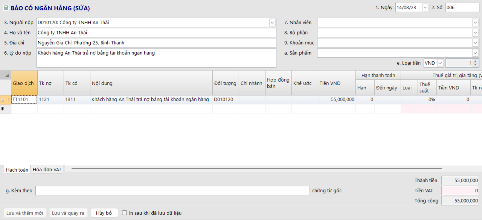 VD: Ngày 11/05/2020, công ty TNHH An Thái trả nợ tiền hàng, số tiền: 55 000 000đ.