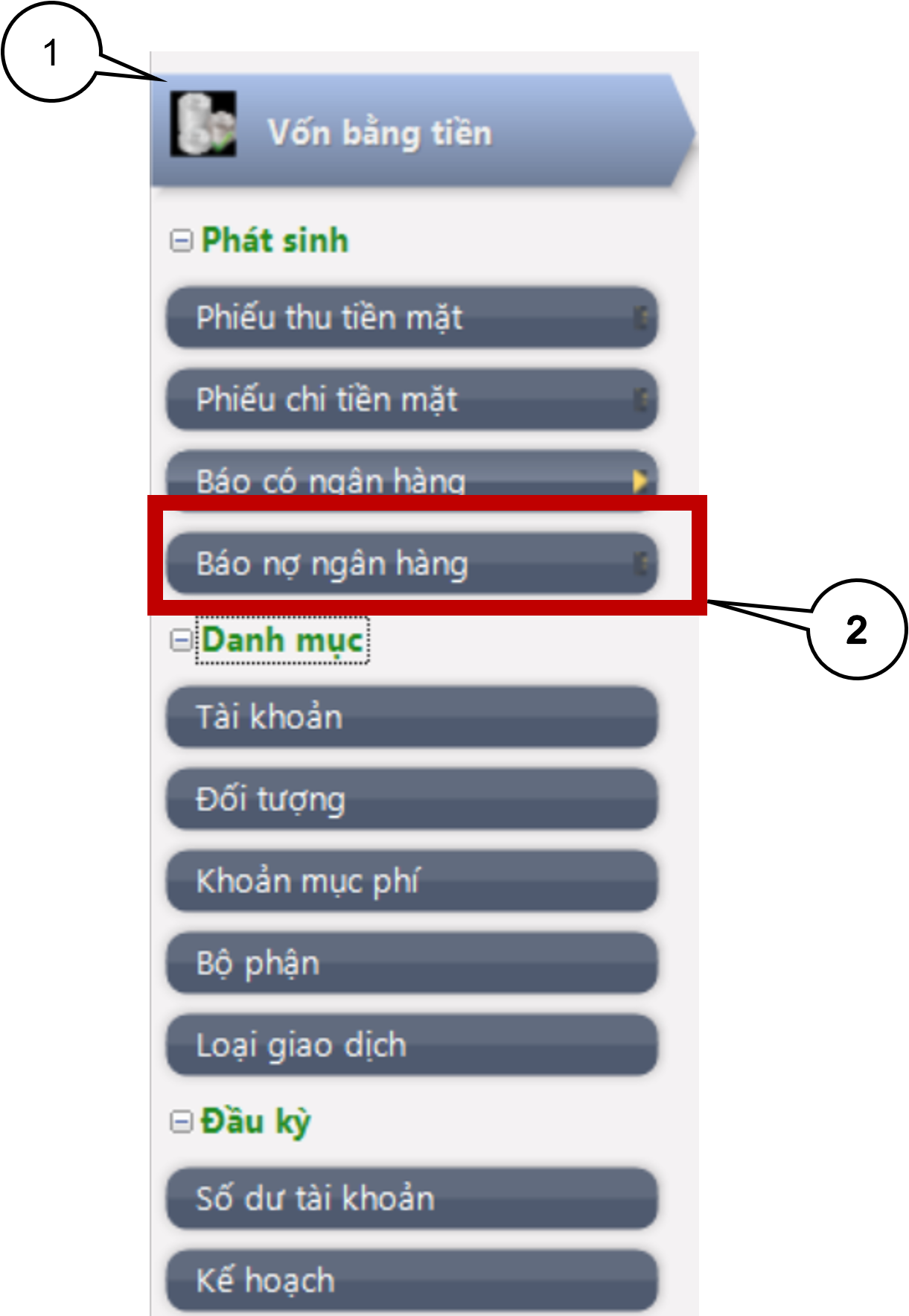 Bước 1: Vào phân hệ Vốn bằng tiền, chọn Báo nợ ngân hàng (hoặc vào tab Chứng từ\Báo nợ ngân hàng).