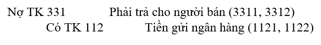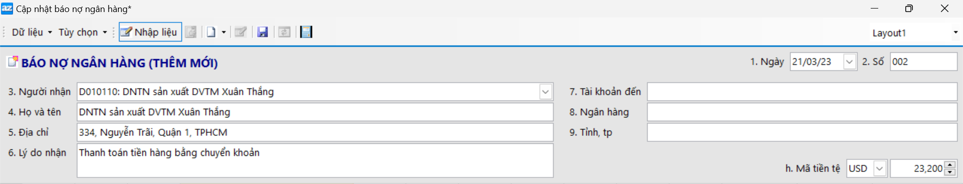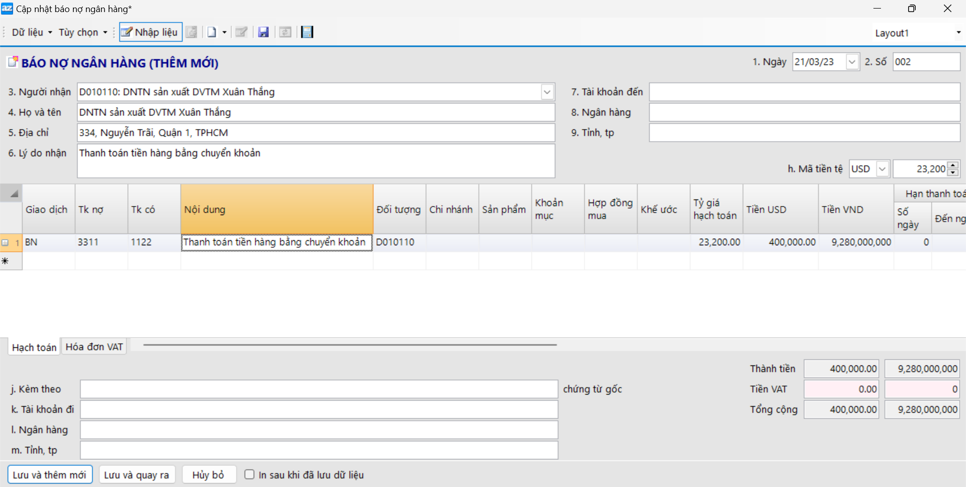 VD: Thanh toán tiền hàng bằng chuyển khoản cho DNTN sản xuất Xuân Thắng (D010110), ngày 21/03 đã nhận được giấy báo nợ của NH. Thanh toán cho HĐ số 892569 ngày 08/01/20 số tiền là 400 000 USD (Tỷ giá là 23 200đ)