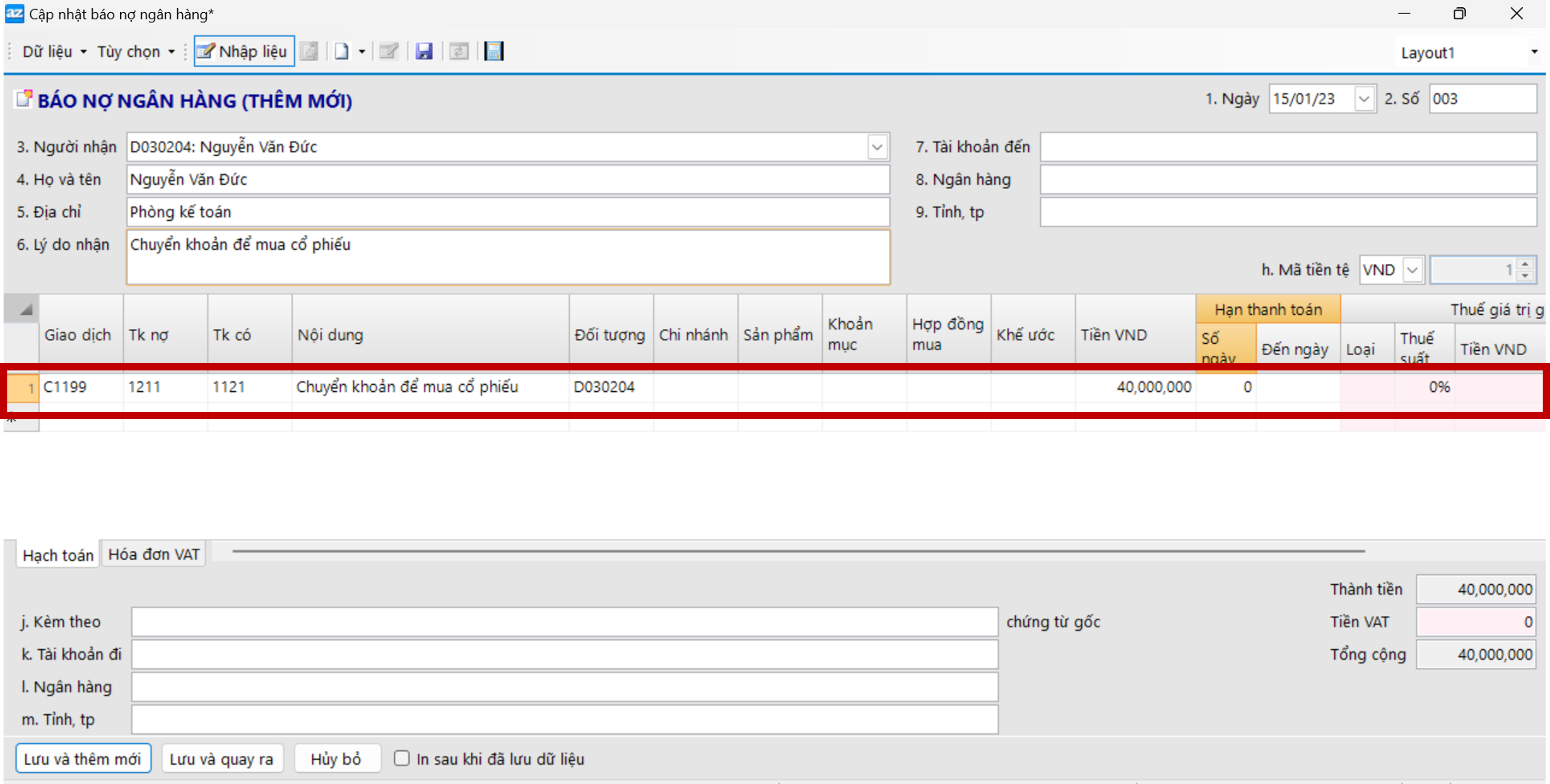 VD: Ngày 15/01/2023, kế toán ghi nhận việc chuyển khoản tiền để mua cổ phiếu với số tiền là 40 000 000đ.