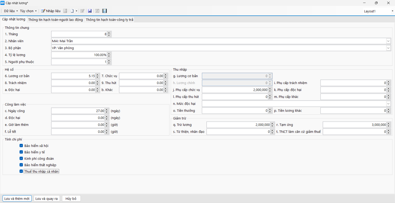 + Tab “Tính chi phí”: Dùng để khai báo các khoản trích theo lương mà người lao động phải nộp.
