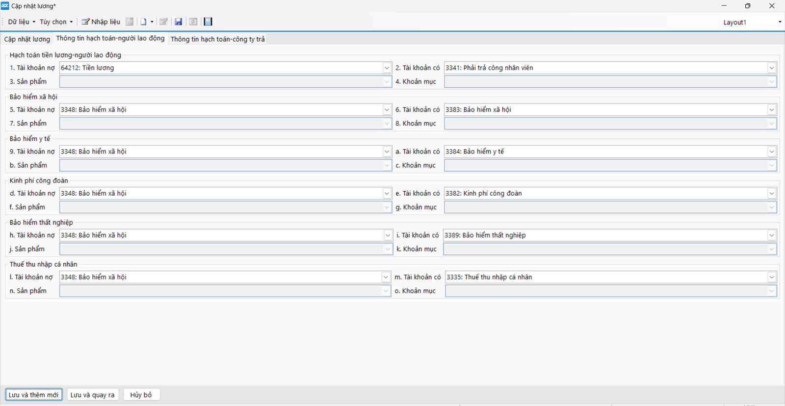 + Tab “Hạch toán”: Khai báo các định khoản khi hạch toán tiền lương trong chứng từ tự động.
