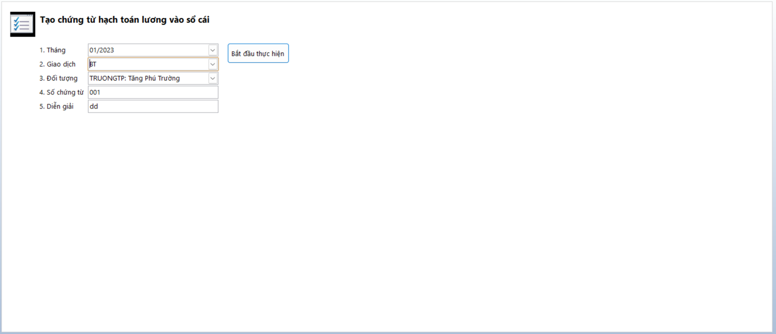 Bước 2: Hộp thoại xuất hiện bạn nhập các thông tin cần thiết vào tháng cần hạch toán lương rồi nhấn Bắt đầu thực hiện