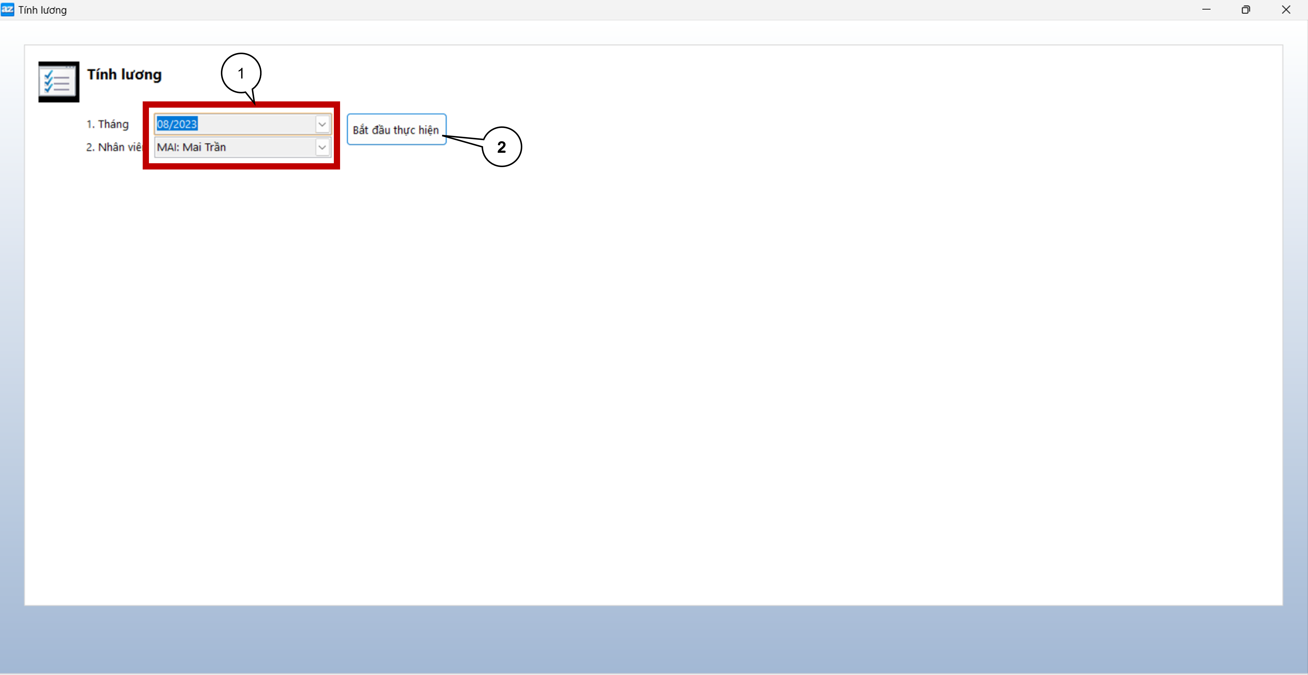 Bước 2: Hộp thoại xuất hiện bạn nhập các thông tin cần thiết vào tháng cần tính lương rồi nhấn Bắt đầu thực hiện