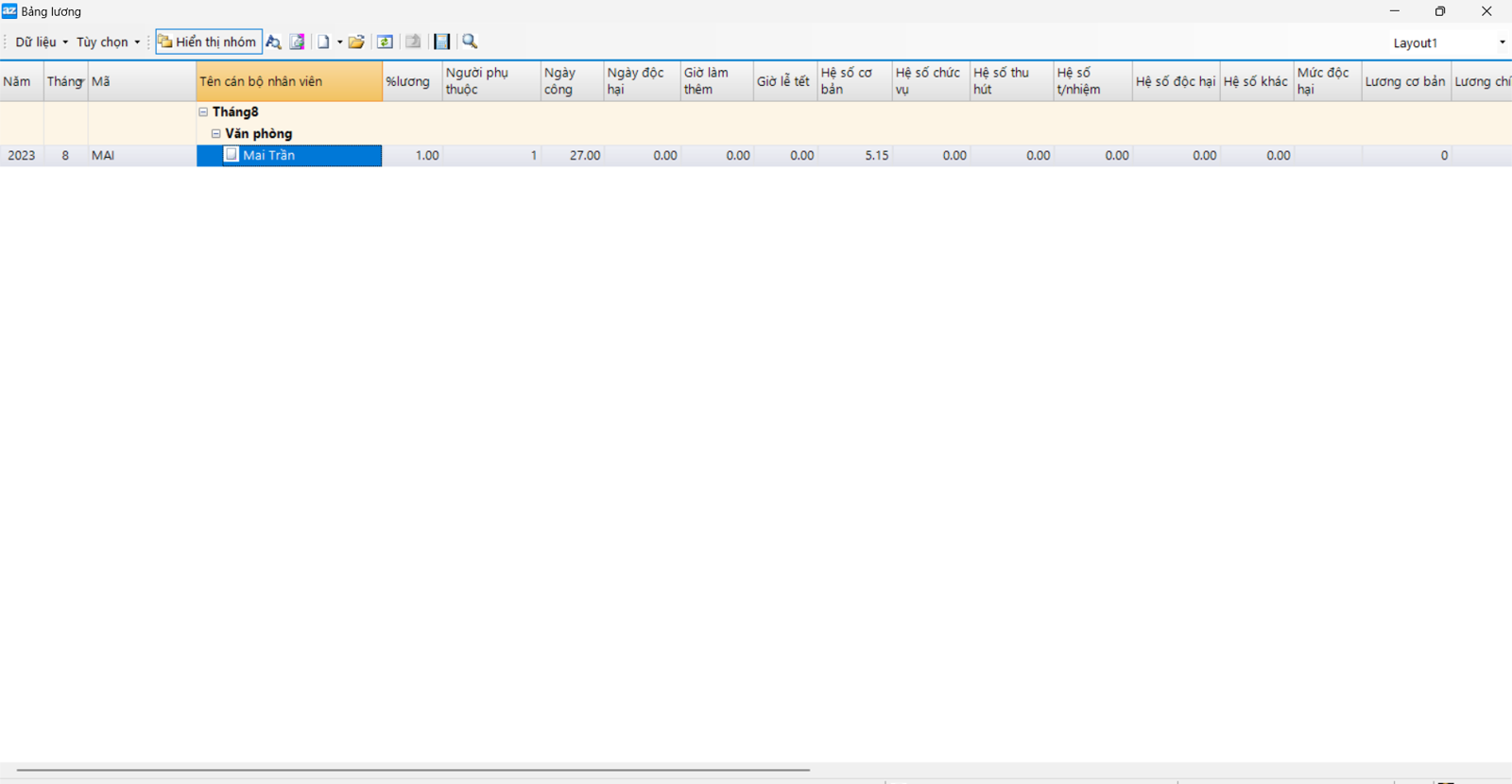 Sau khi thêm mới nhân viên cần thanh toán lương, chương trình sẽ hiện thị danh sách như sau: