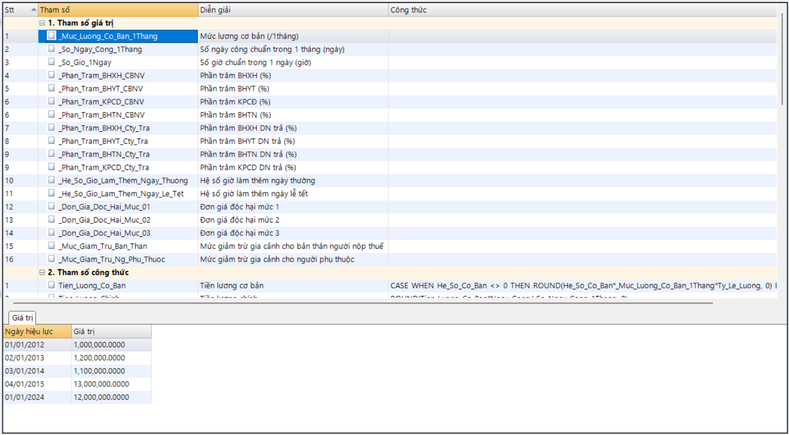 Page “Tham số” cho phép khai báo các tham số tính lương áp dụng chung cho cả doanh nghiệp như mức lương cơ bản, số ngày công chuẩn, phần trăm các loại bảo hiểm ...