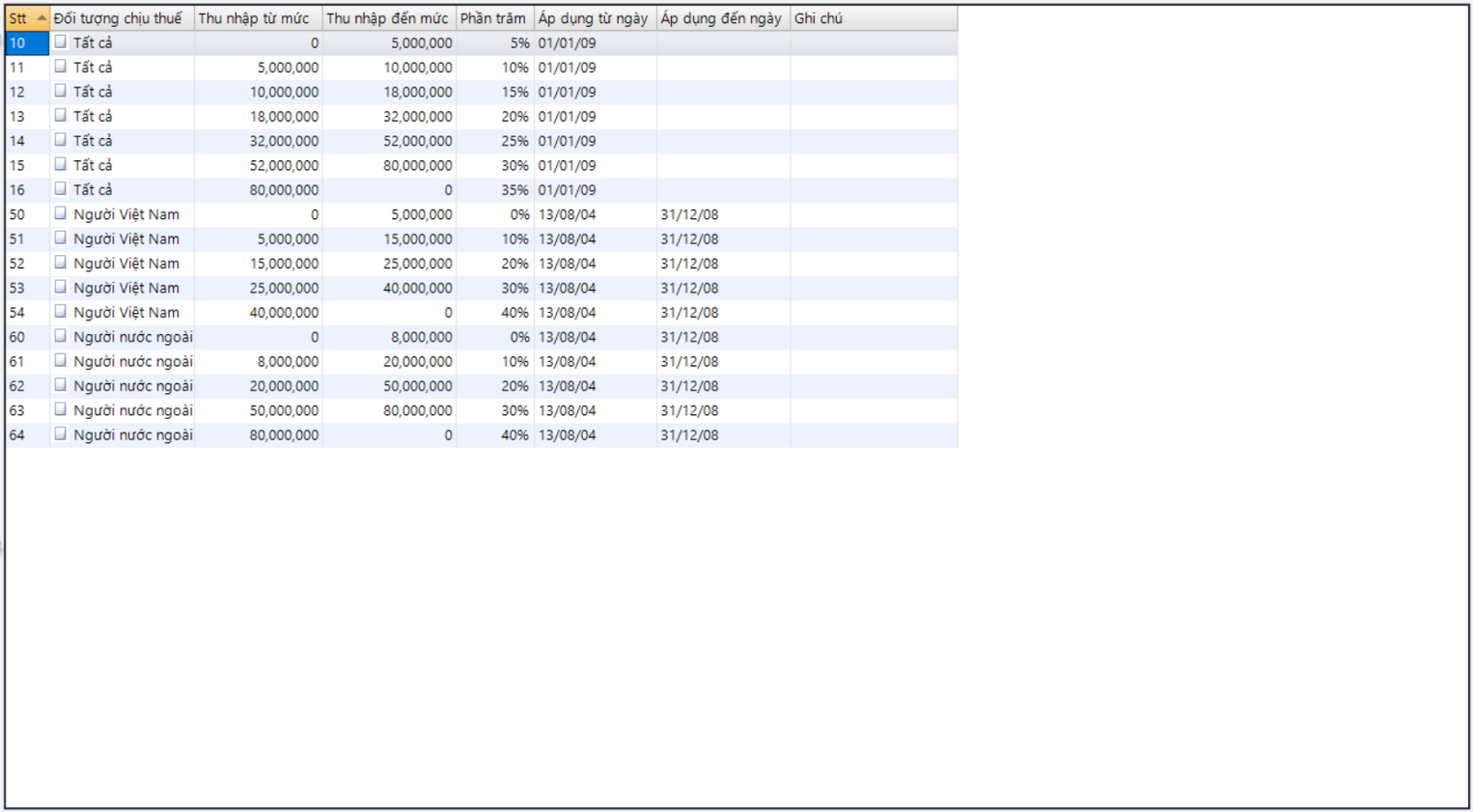 Page “Mức thuế thu nhập cá nhân” cho phép doanh nghiệp có thể khai báo mức thuế TNCN nhằm tính thuế TNCN theo quy định của pháp luật. Phần mềm sẽ tự động tính thuế TNCN cho nhân viên khi thực hiện “Tính lương”.