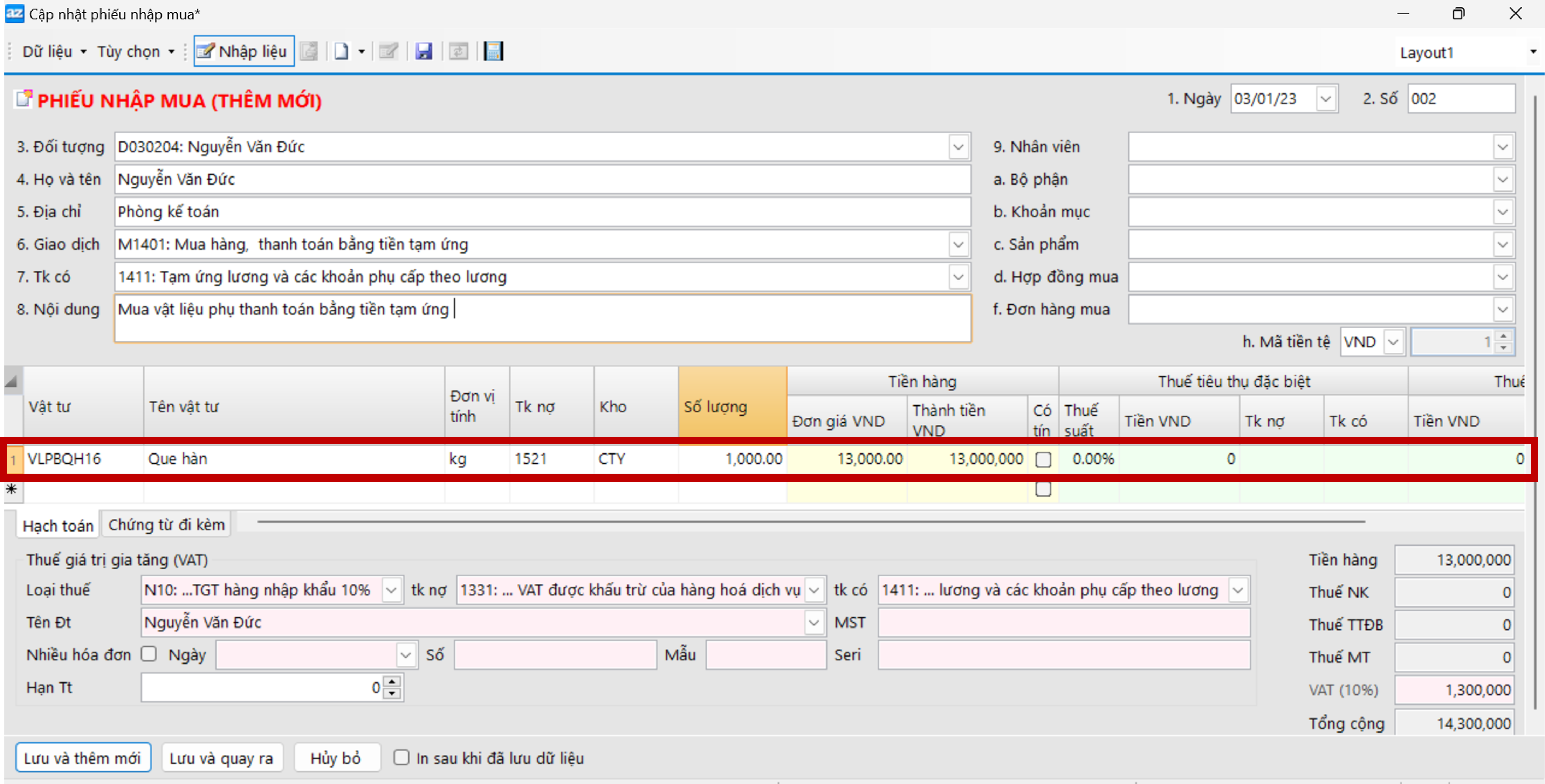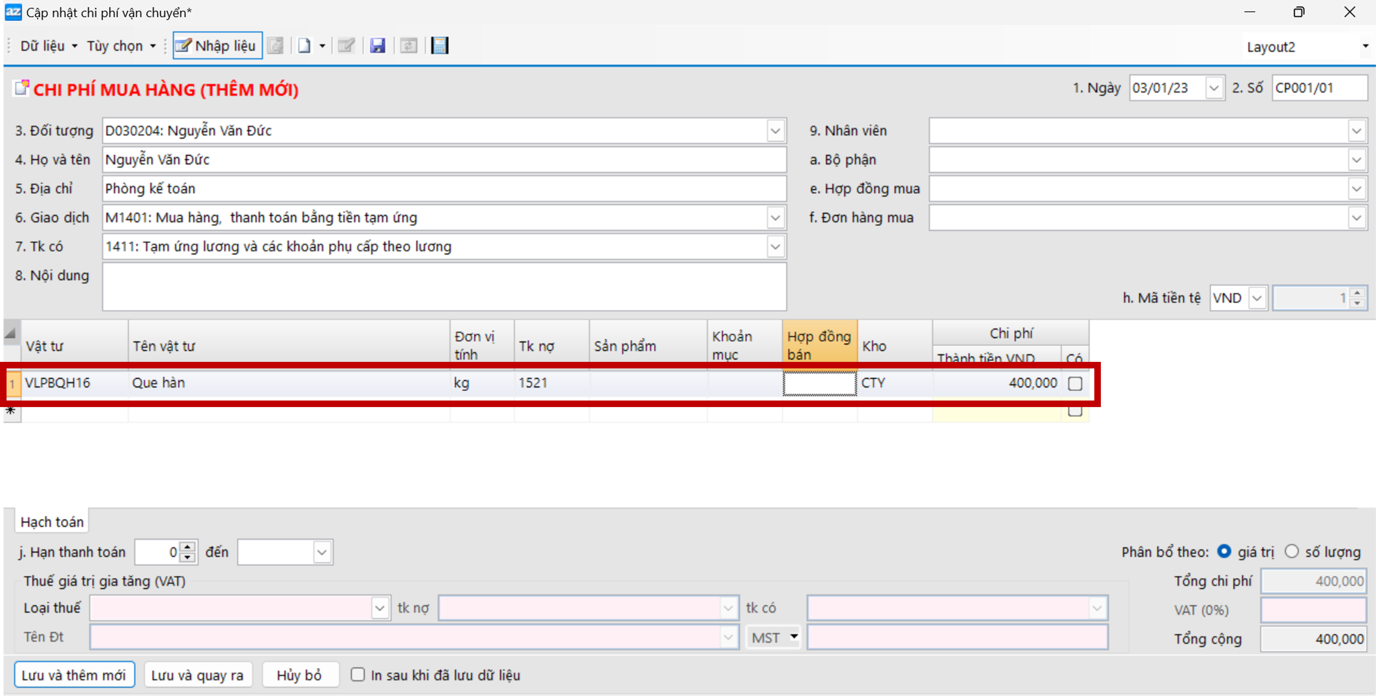 VD: Ngày 03/01 kế toán nhận được bảng kê thanh toán tạm ứng kèm theo các chứng từ gốc có liên quan của Nguyễn Văn Đức (D020304) về số vật liệu phụ đã mua và chi phí vận chuyển, bốc dỡ vật liệu phụ này.