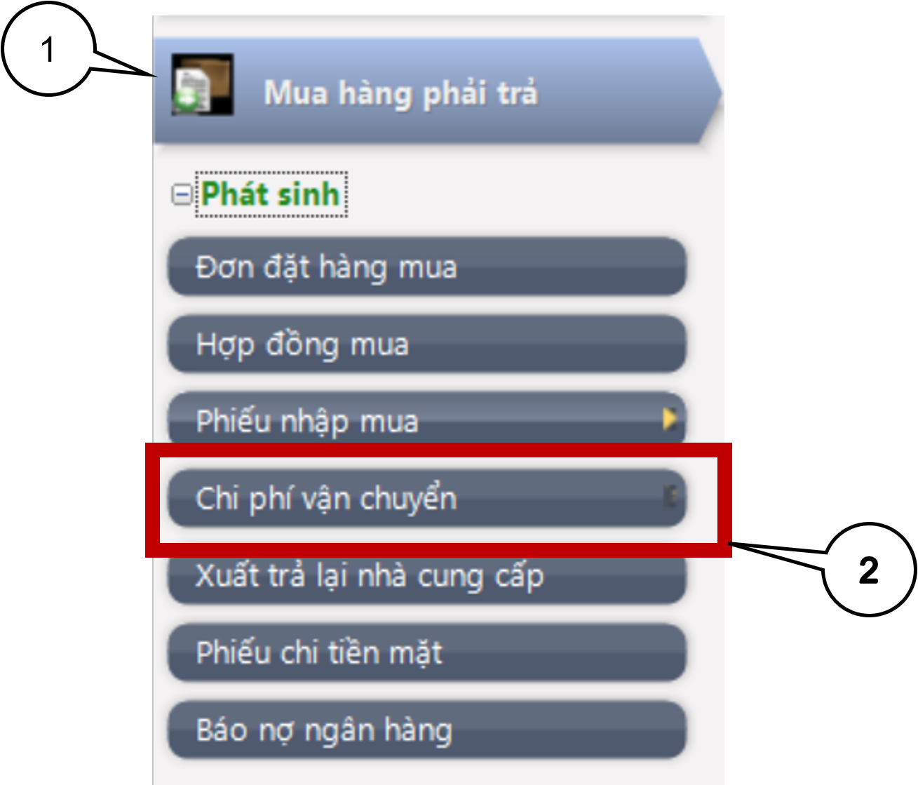 Bước 3: Vào phân hệ Mua hàng phải trả, chọn Chi phí vận chuyển ( hoặc vào Chứng từ \6. Chi phí vận chuyển).