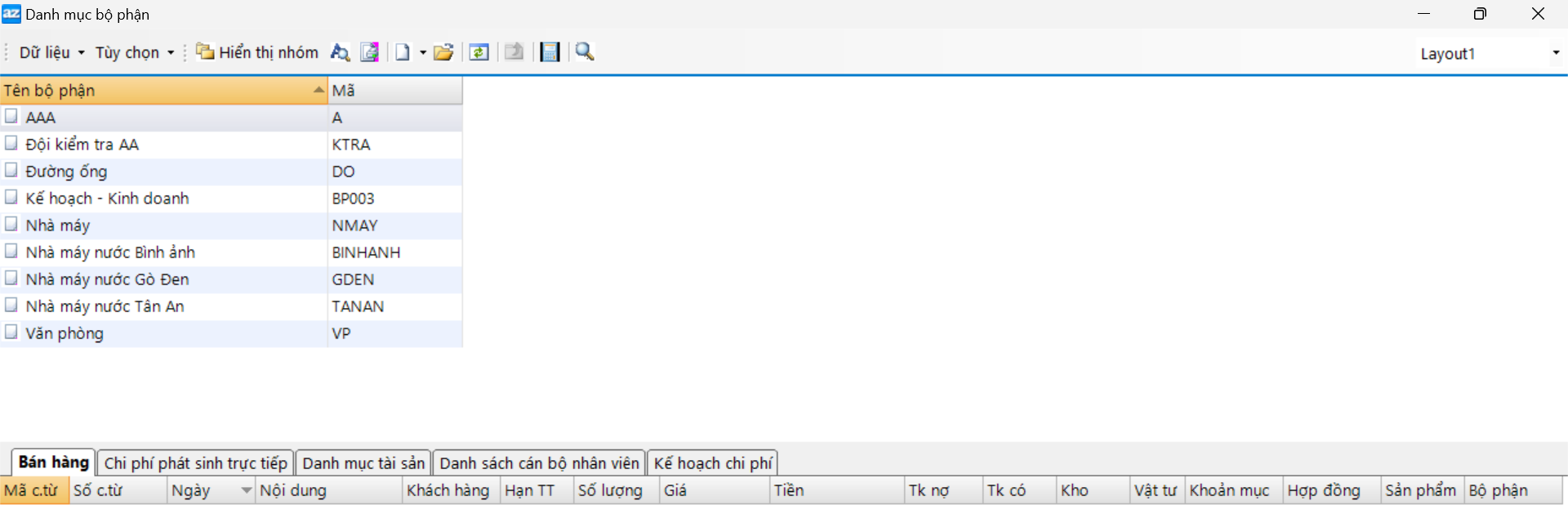 Danh mục bộ phận dùng để theo dõi quản lý theo bộ phận. Bộ phận được dùng trong trường hợp bộ phận sử dụng tài sản cố định và bộ phận bán hàng.