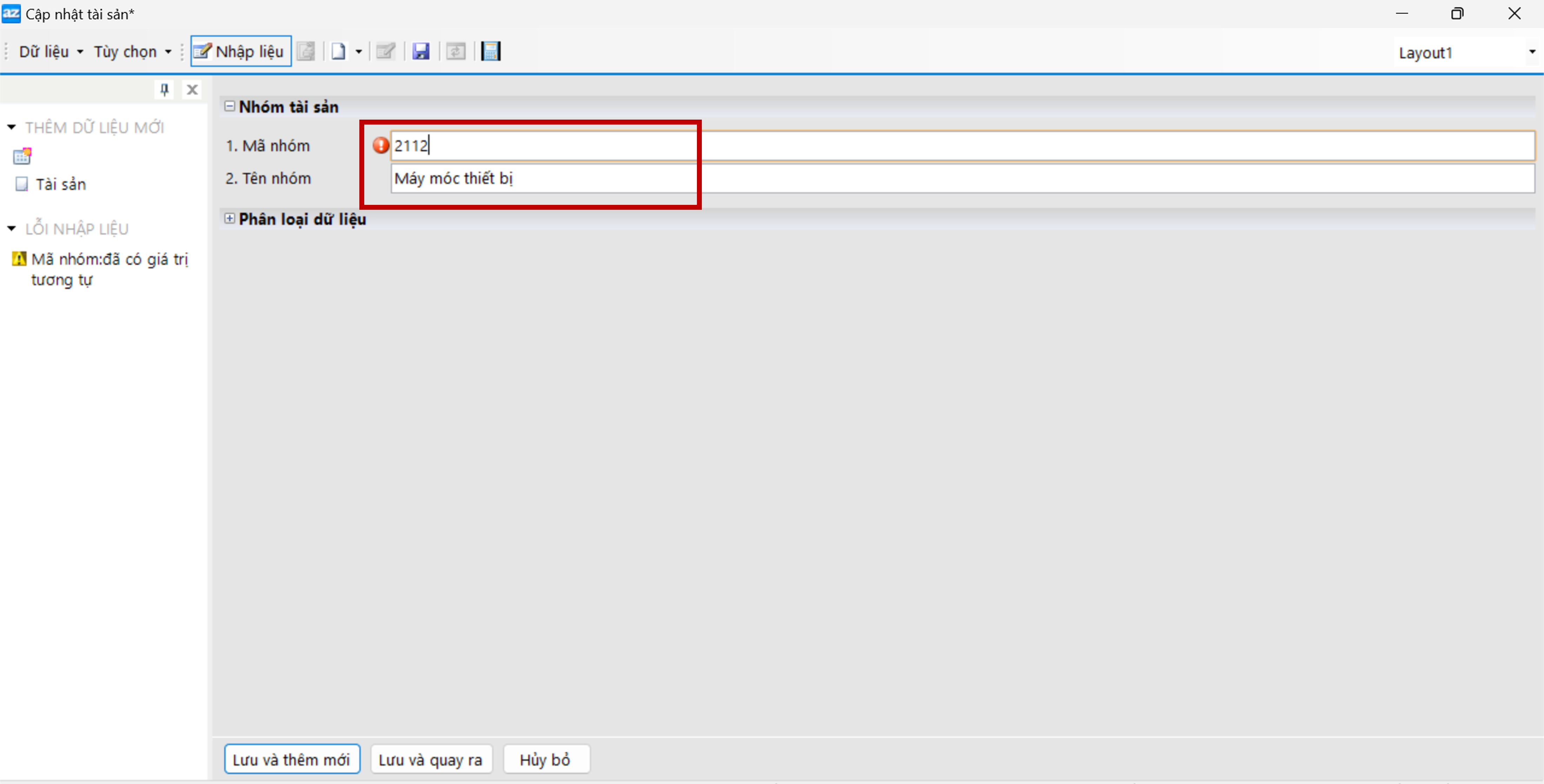 | Mã nhóm | Mã nhóm tài sản, lưu trữ tối đa 16 ký tự. |