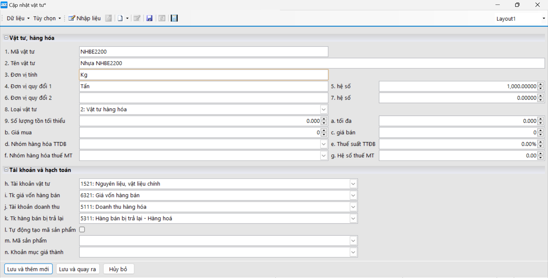 Chúng ta có thể theo dõi nhiều đơn vị tính cho một loại vật tư, hàng hóa, sản phẩm với một hệ số quy đổi nhất định bằng cách nhập giá trị thông tin “Ðơn vị quy đổi” và “Hệ số”.