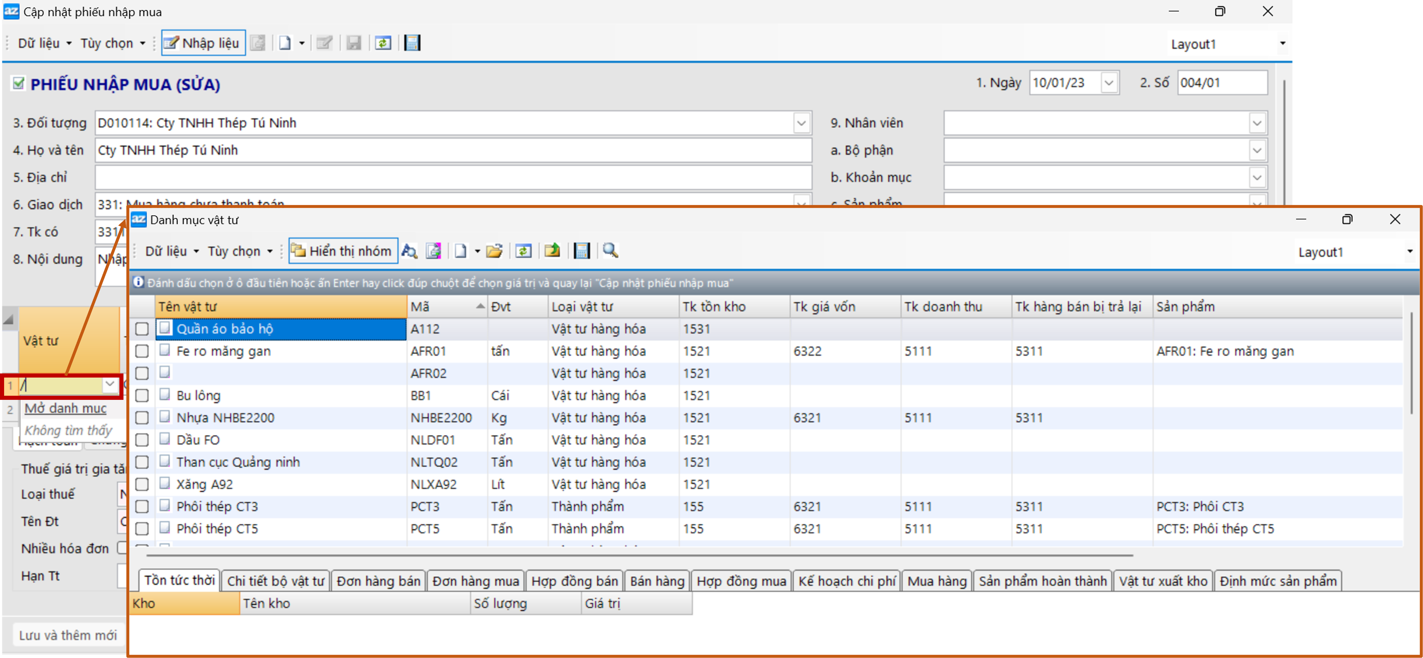 2.2. Thêm vật tư hàng hóa khi thêm chứng từ