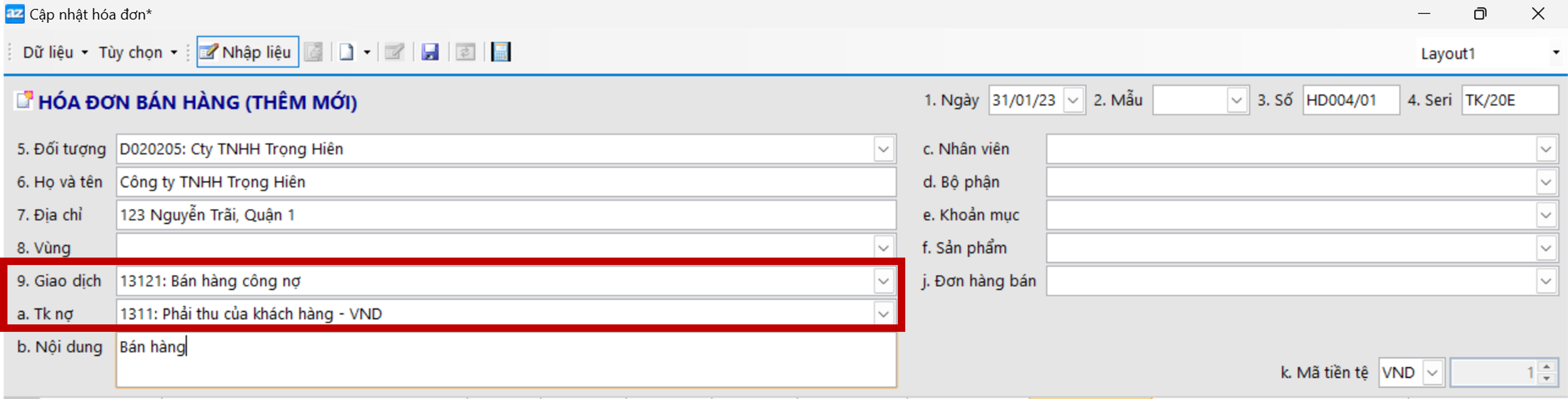 - Tại mục Mã nhập xuất: chọn 13121 – Bán hàng công nợ - VND.