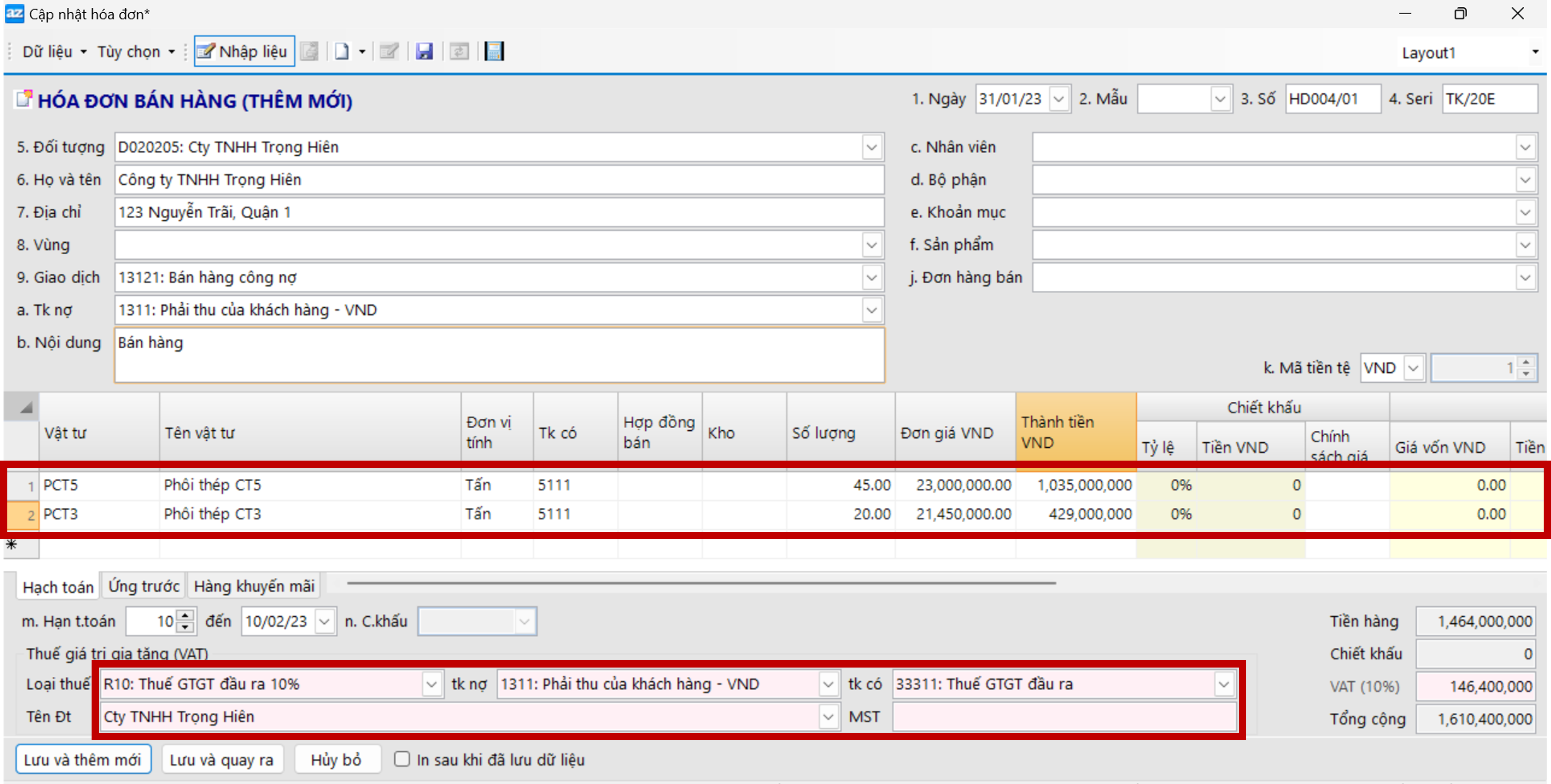 VD: Ngày 31/01, bộ phận kinh doanh bán hàng công nợ cho công ty TNHH Trọng Hiên (D020205), hạn thanh toán là 10 ngày.