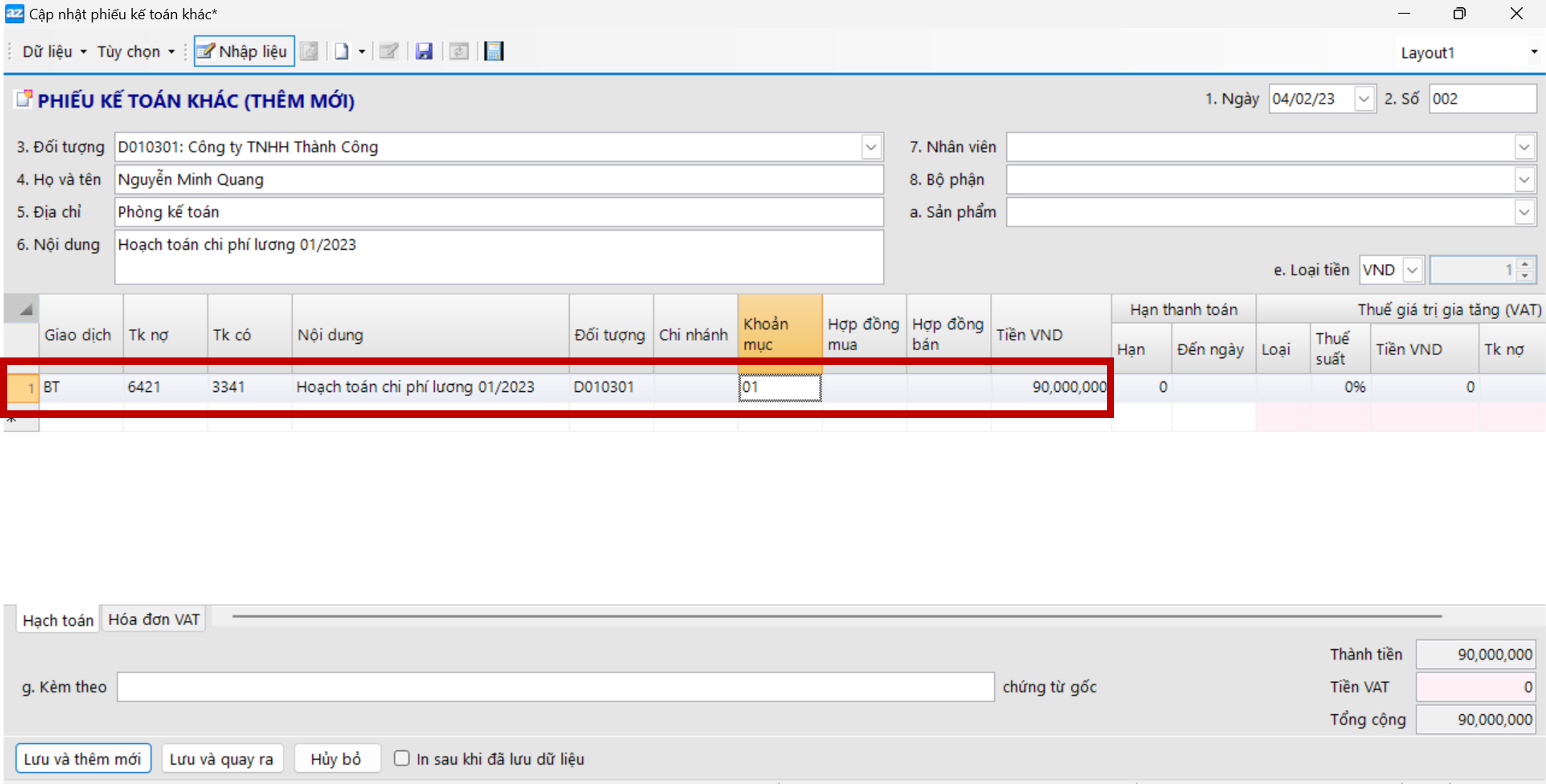 - Khai báo TK nợ và TK có và số tiền phát sinh tương ứng với từng dòng định khoản.