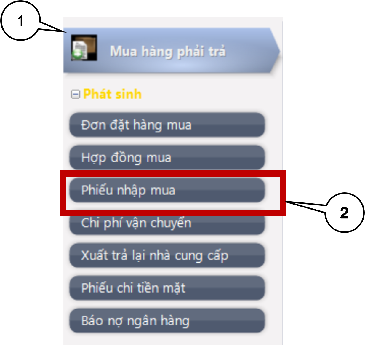 Bước 1: Vào phân hệ Mua hàng phải trả, chọn Phiếu nhập mua ( hoặc vào Chứng từ \5. Phiếu nhập mua).