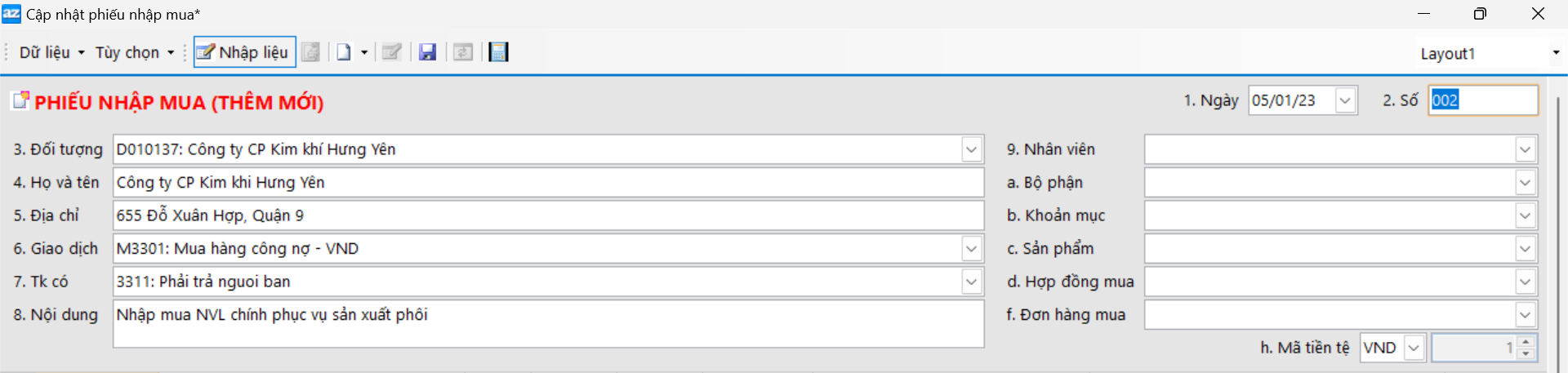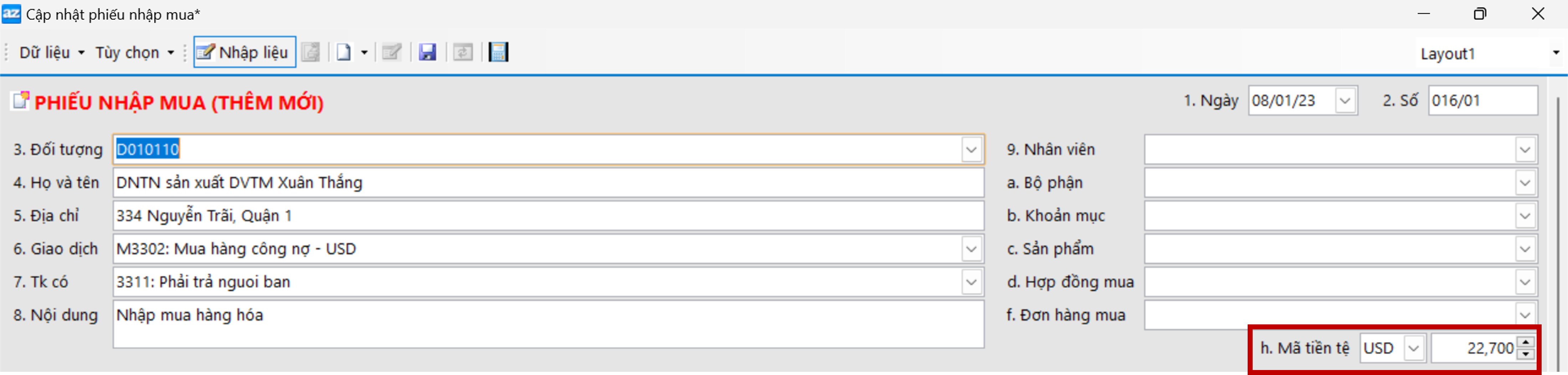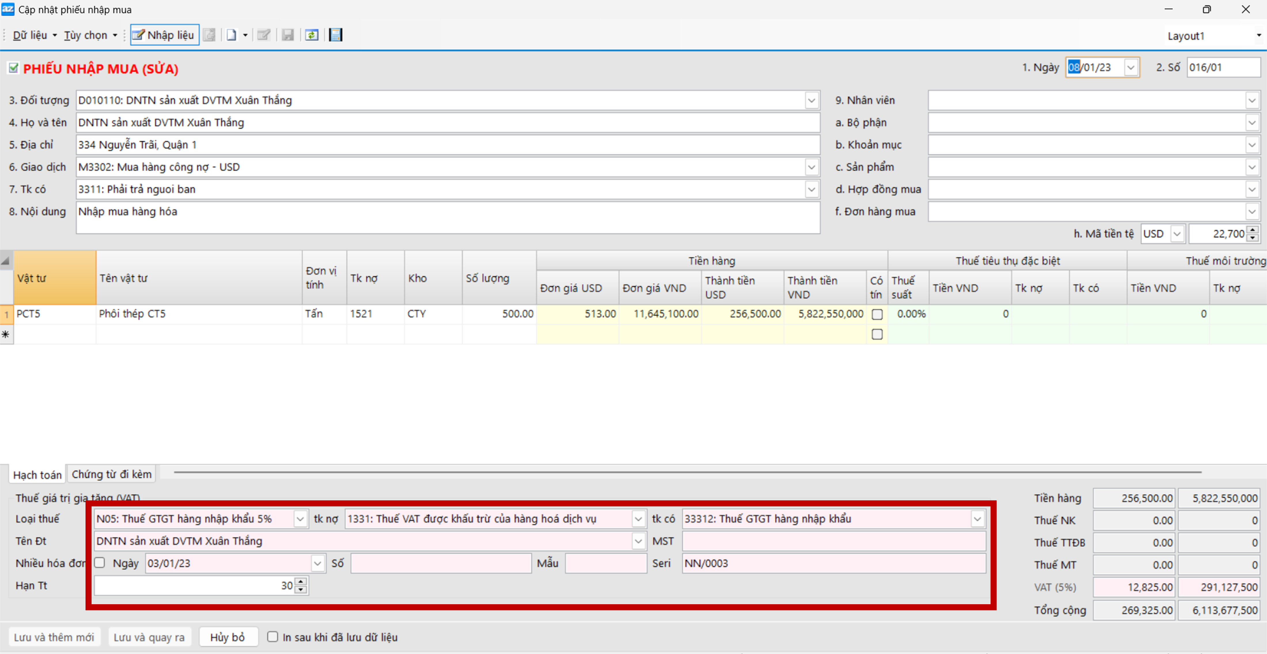 VD: Phiếu nhập mua số 016/01 ngày 08/01 theo HĐ số NN001 ngày 03/01 (Số seri NN/0003). Nhập khẩu phôi thép chưa thanh toán tiền cho DNTN sản xuất DVTM Xuân Thắng (D010110). Mua hàng bằng tiền ngoại tệ 997 500 USD (Tỷ giá 22 700đ), thuế 5%. Hạn thanh toán 30 ngày.