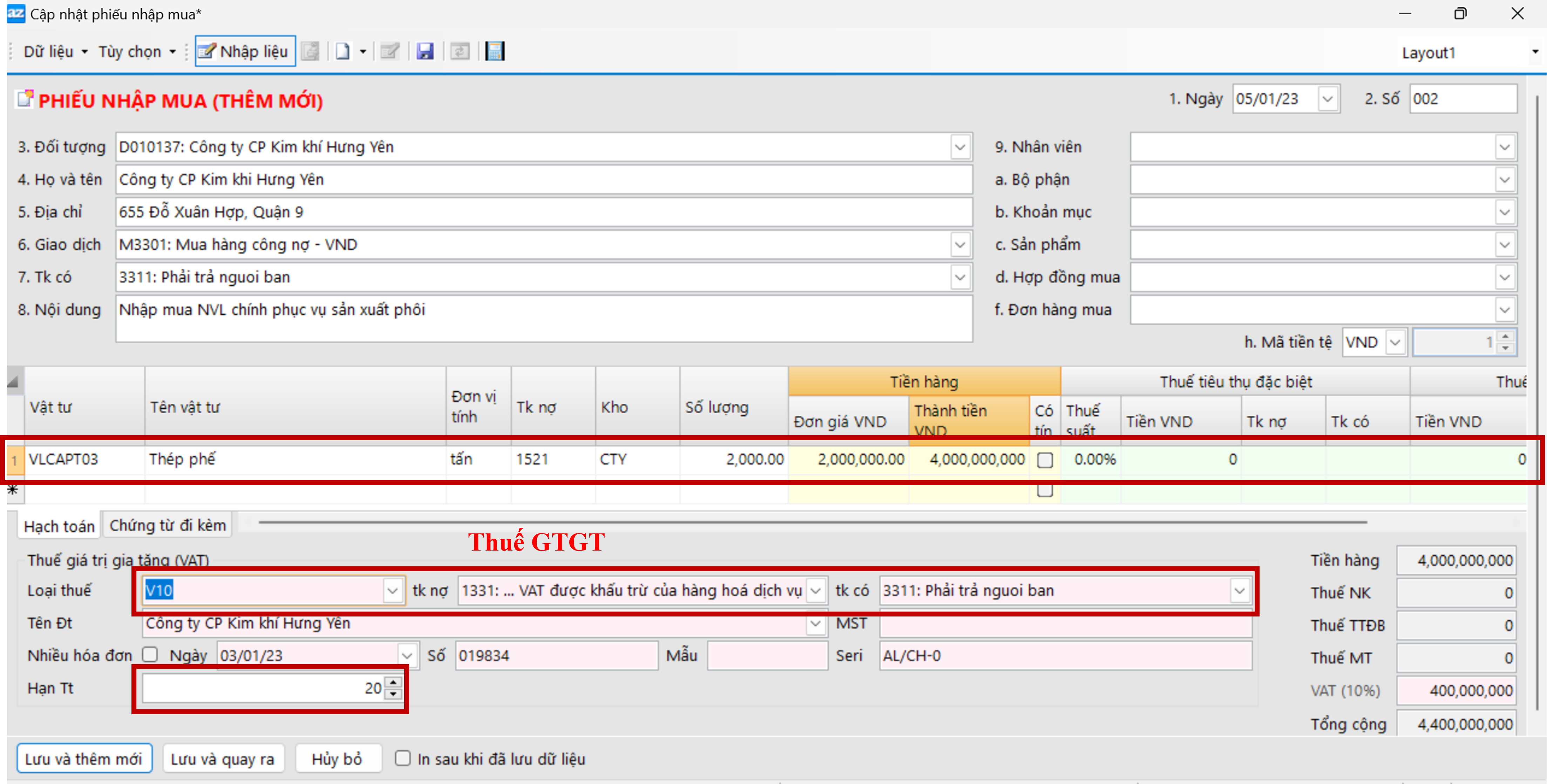 VD: Ngày 05/01 nhập mua nguyên vật liệu chính phục vụ cho sản xuất phôi chưa thanh toán cho Công ty Kim khí Hưng Yên (D010137) theo HĐ số 019834 ngày 03/01 (Số Seri AL/CH-0). Hạn thanh toán trong vòng 20 ngày, HĐ được liệt kê như sau: