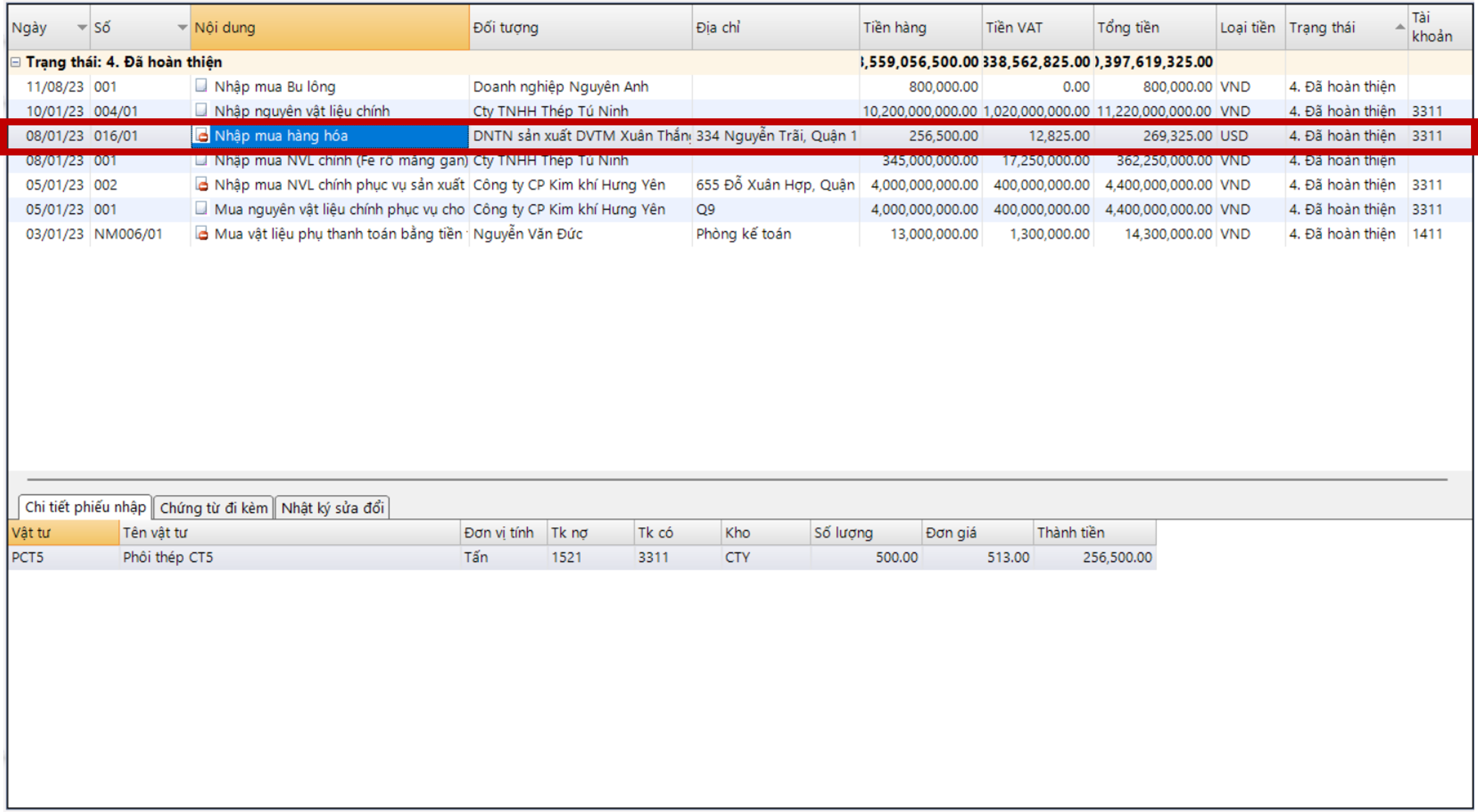 VD: Chọn phiếu nhập mua số 016/01 ngày 08/01/2023