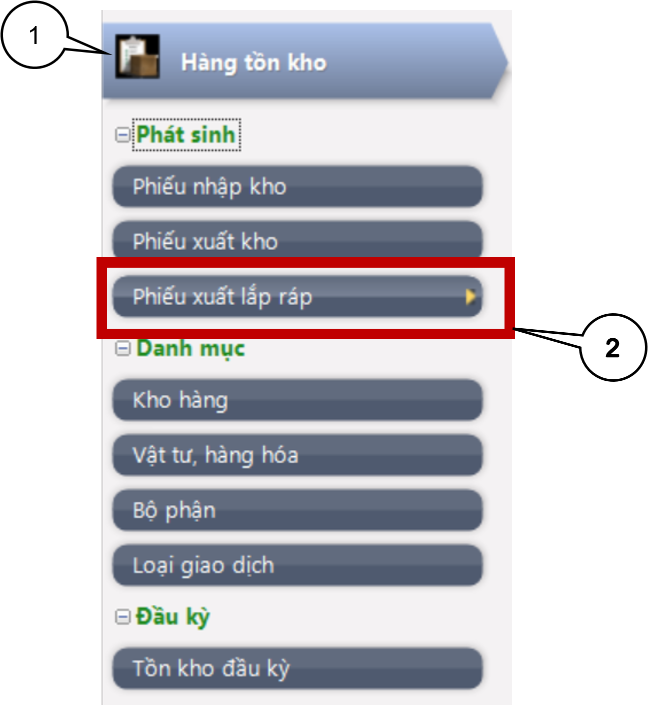 Bước 1: Vào phân hệ Hàng tồn kho chọn Phiếu xuất lắp ráp hoặc Chọn (Chứng từ\d.Phiếu xuất lắp ráp)