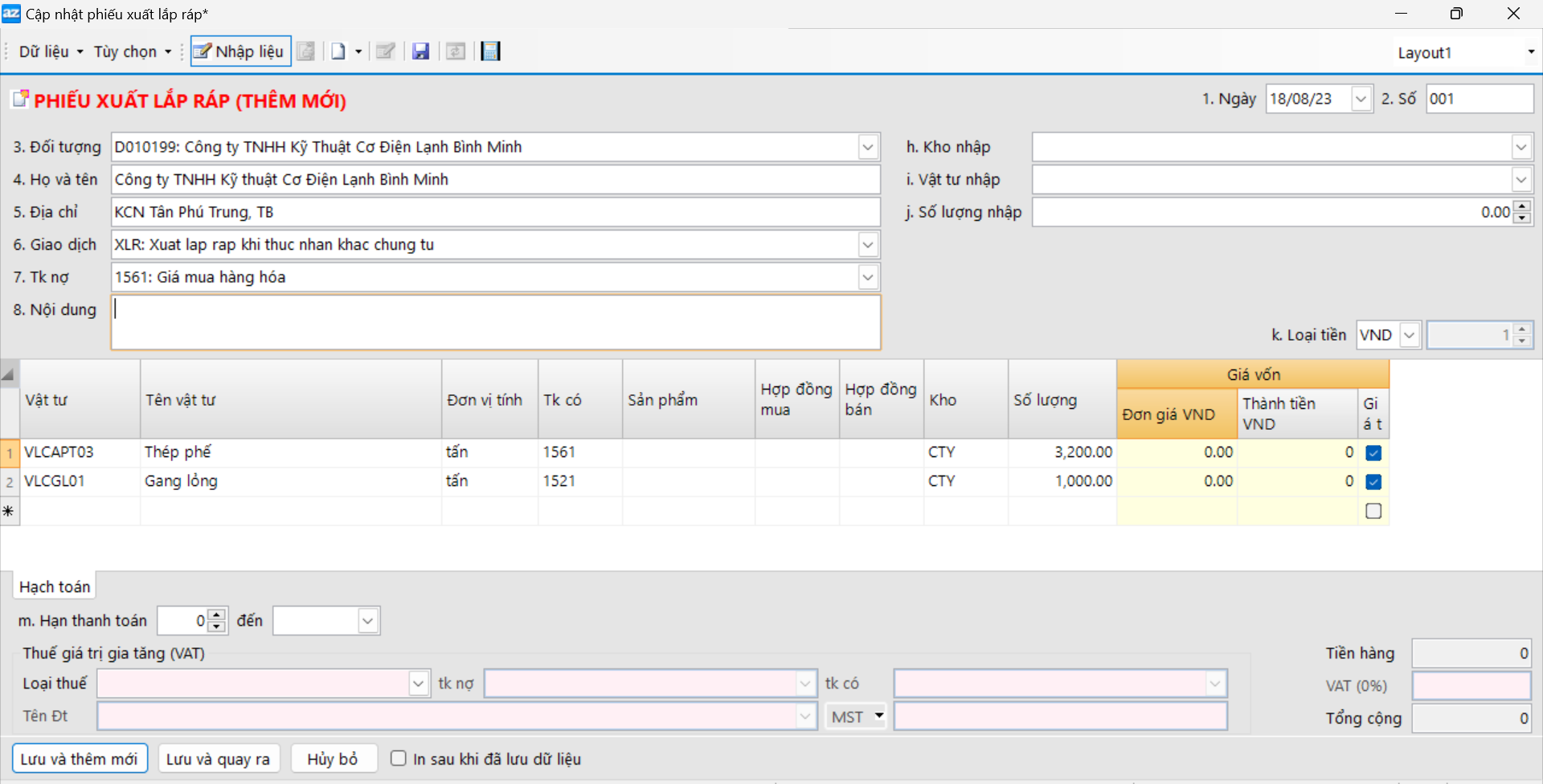 - Số lượng nhập: Số lượng vật tư, hàng hóa nhập sau khi lắp ráp hoàn chỉnh. Giá vốn của vật tư nhập sẽ được cập nhật theo tổng tiền vốn của các vật tư xuất chia số lượng nhập ở trên.