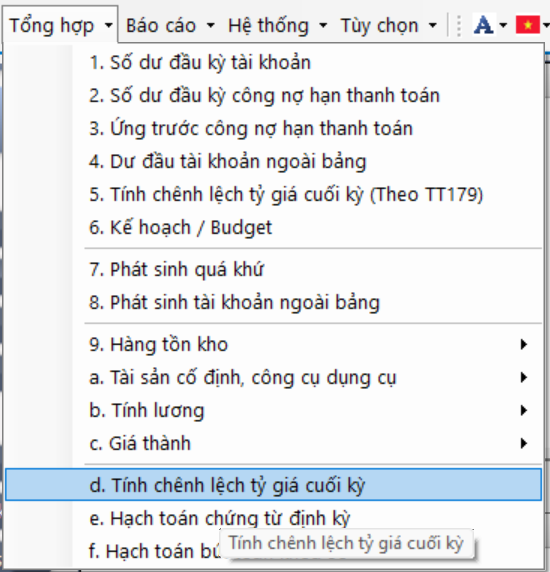 Bước 1: Từ menu hệ thống chọn “Tong hop\Chênh lệch tỷ giá tự động”