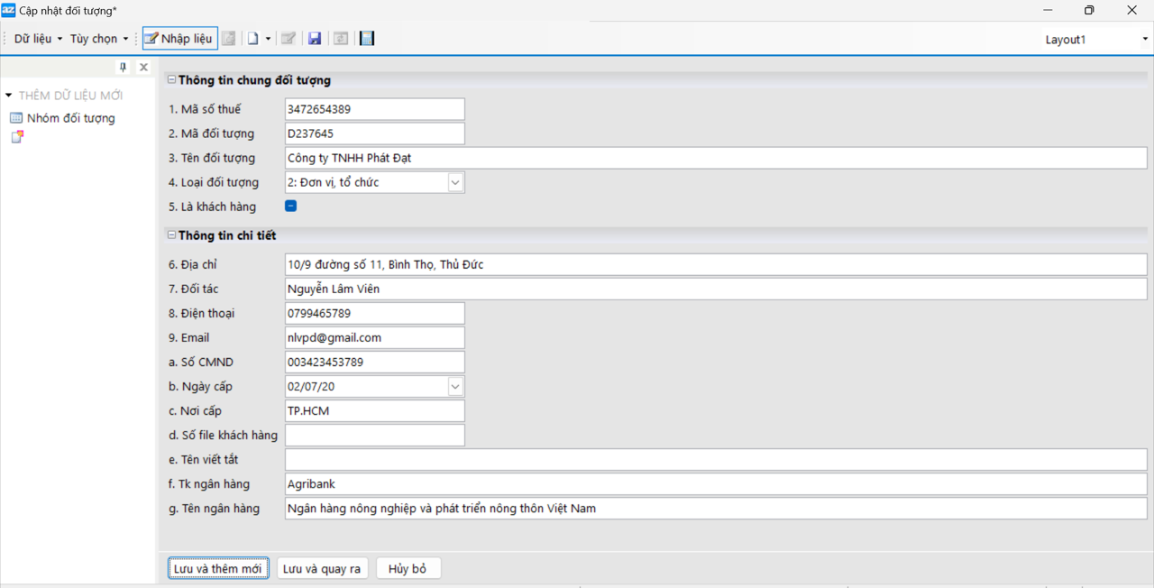 | Mã đối tượng | Mã đối tượng là duy nhất, lưu trữ tối đa 16 ký tự. |