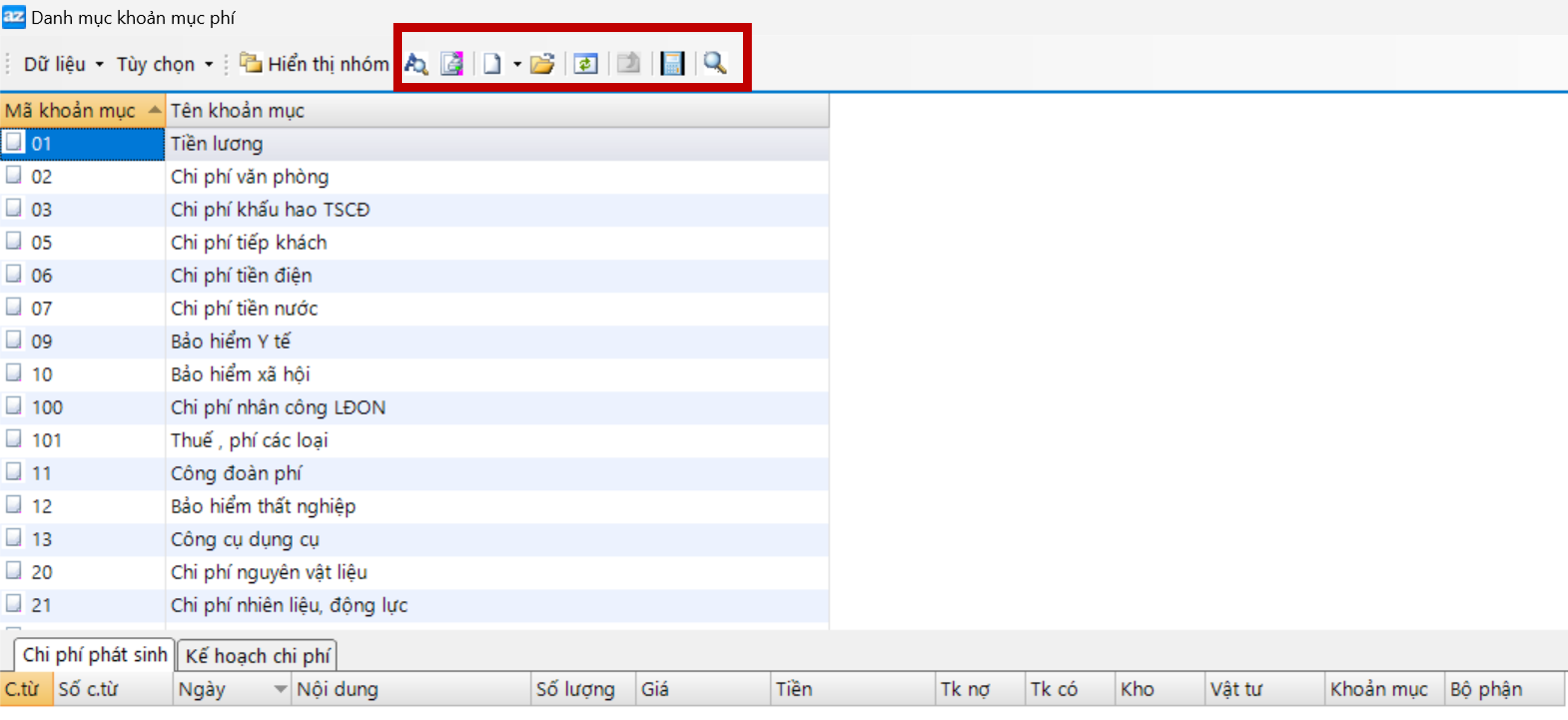 Danh mục khoản mục phí dùng để khai báo các khoản mục chi phí, theo dõi chi tiết các khoản mục phí liên quan đến tài khoản 641, 642, 627,… AZSOFT đã thiết lập sẵn hệ thống chi tiết các khoản mục phí. Tuy nhiên, kế toán có thể thêm, sửa đổi hoặc xoá bỏ các khoản mục phí đã có sao cho phù hợp với yêu cầu quản lý thực tế của doanh nghiệp.