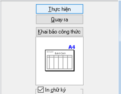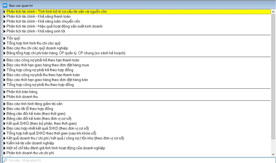Bước 2: Trong danh sách các báo cáo quản trị chọn tới một trong các báo cáo phân tích tài chính cần lập, sau đó nhấp chọn nút “Thực hiện”.