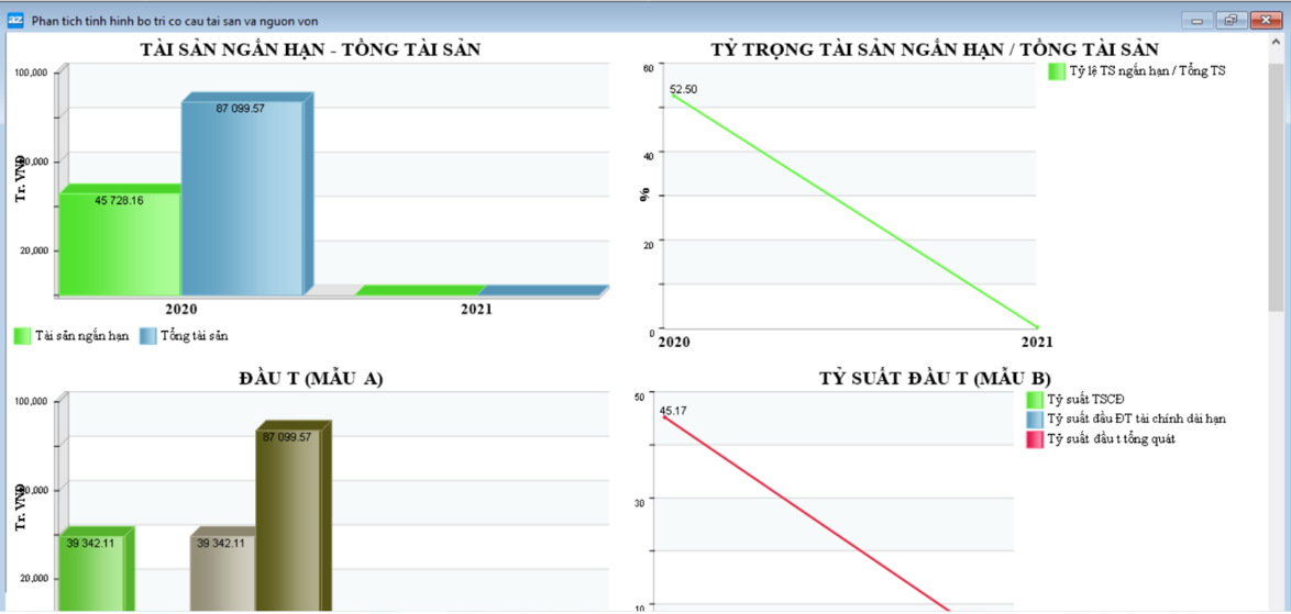 Chức năng này cung cấp một danh sách báo cáo phân tích các chỉ tiêu tài chính dưới dạng biểu đồ ví dụ như các chỉ tiêu về tình hình bố trí tài sản nguồn vốn, các chỉ tiêu về khả năng thanh toán, luân chuyển vốn hay khả năng sinh lời,…