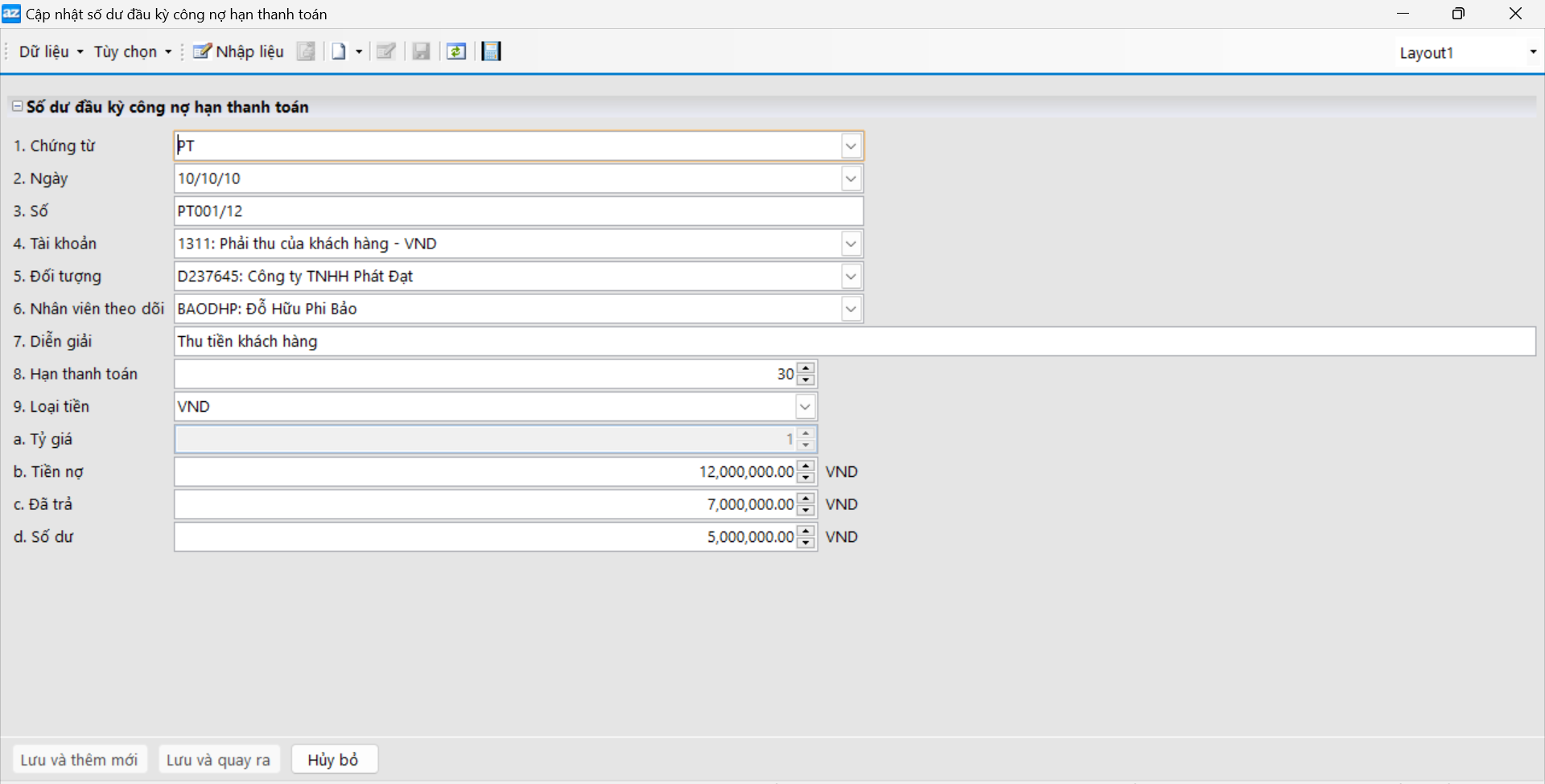 Lưu ý: Ta có thể sử dụng chức năng hạn toán cho các khoản nợ tạm ứng, nợ vay.