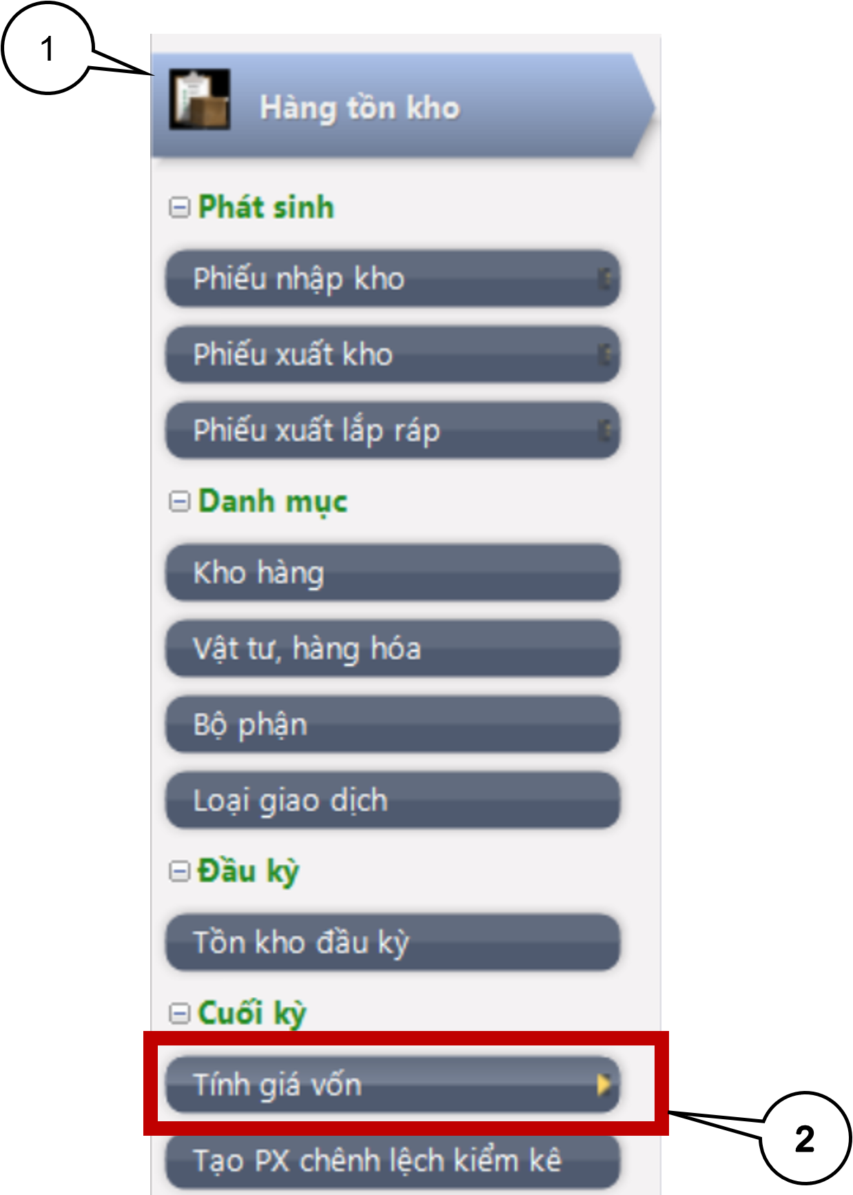 Dùng để tính giá vốn cho các mặt hàng xuất kho, nó chỉ có hiệu lực với những dòng chi tiết chứng từ có đánh dấu “Tự động tính giá vốn”. Ðể thực hiện, từ hệ thống menu nhấp chọn “Tong hop\Tính giá vốn hàng xuất” hoặc vào phân hệ Hàng tồn kho chọn Tính giá vốn hàng xuất.