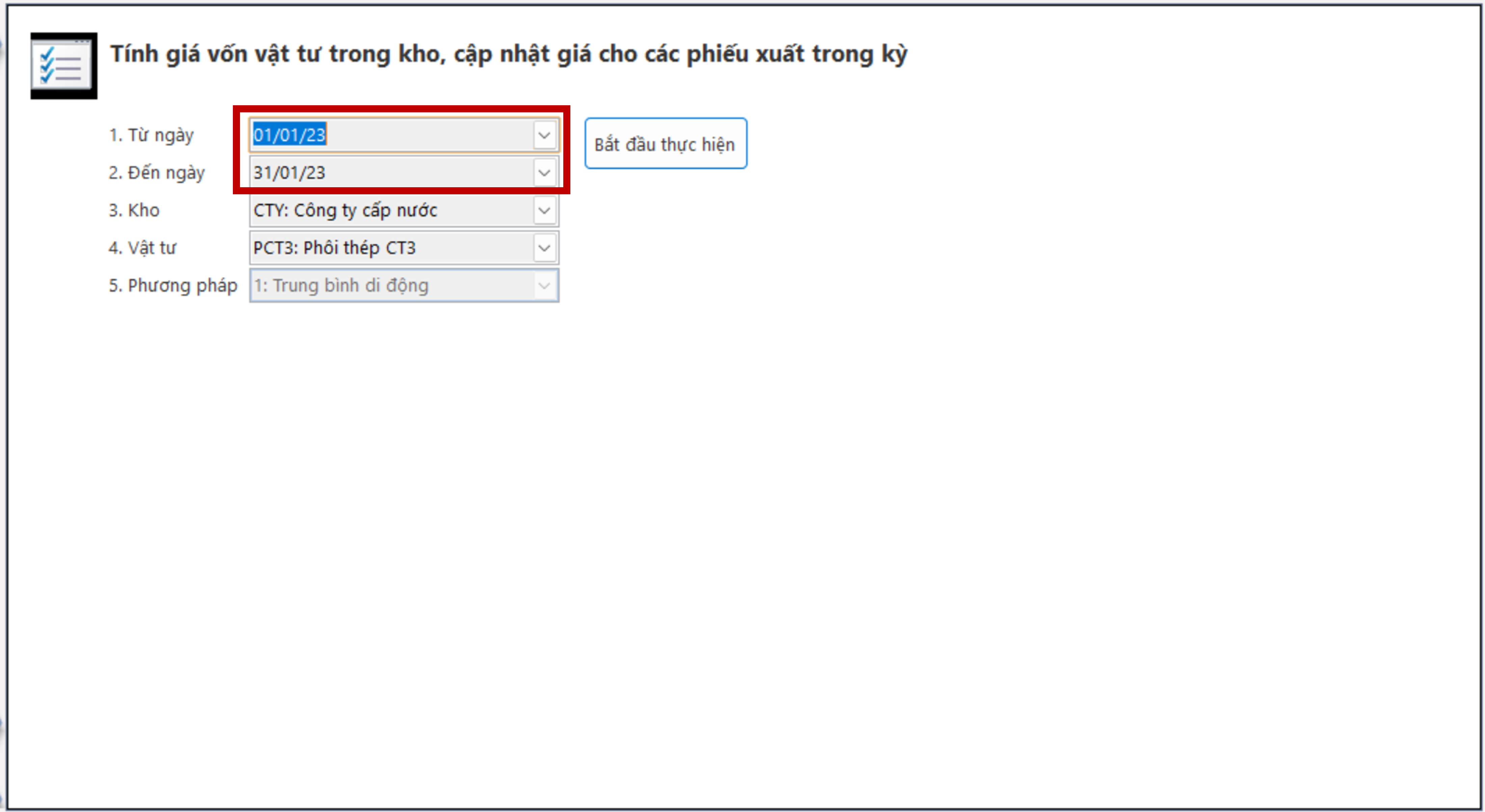 - Vật tư: Chỉ định các vật tư cần tính giá. Nếu tính cho tất cả các vật tư thì ta bỏ qua thông tin này.