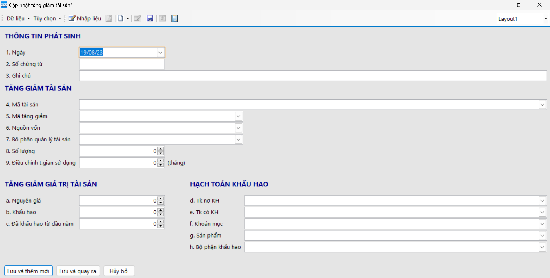 Từ đây chúng ta có thể thêm, sửa, xóa những biến động tài sản cần quản lý. Nhấn F2 hoặc Thêm để hiển thị thông tin thêm phát sinh của tài sản.