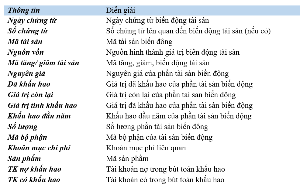 Dưới đây là thông tin chi tiết khi cập nhật các biến động tài sản: