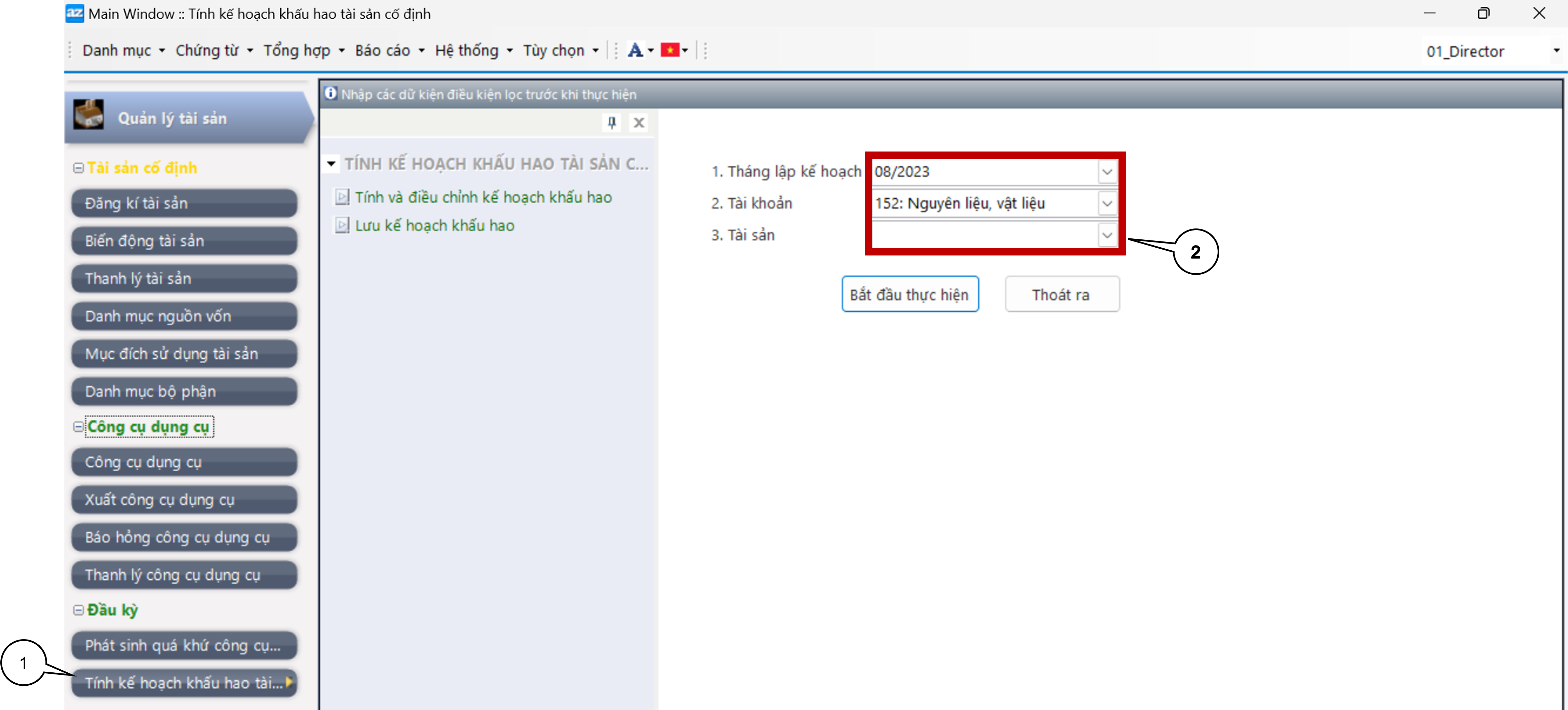 Trong màn hình “Trích khấu hao tài sản” hãy nhập các điều kiện tính khấu hao vào các ô nhập ở góc trên bên trái màn hình, sau đó nhấp chọn lần lượt các nút “Tính kế hoạch khấu hao”, “Lưu kế hoạch khấu hao”, “Lấy dữ liệu”, “Tính khấu hao tháng”, “Lưu khấu hao tháng” để máy tính tự động tính khấu hao cho các tài sản cố định được khấu hao trong kỳ.