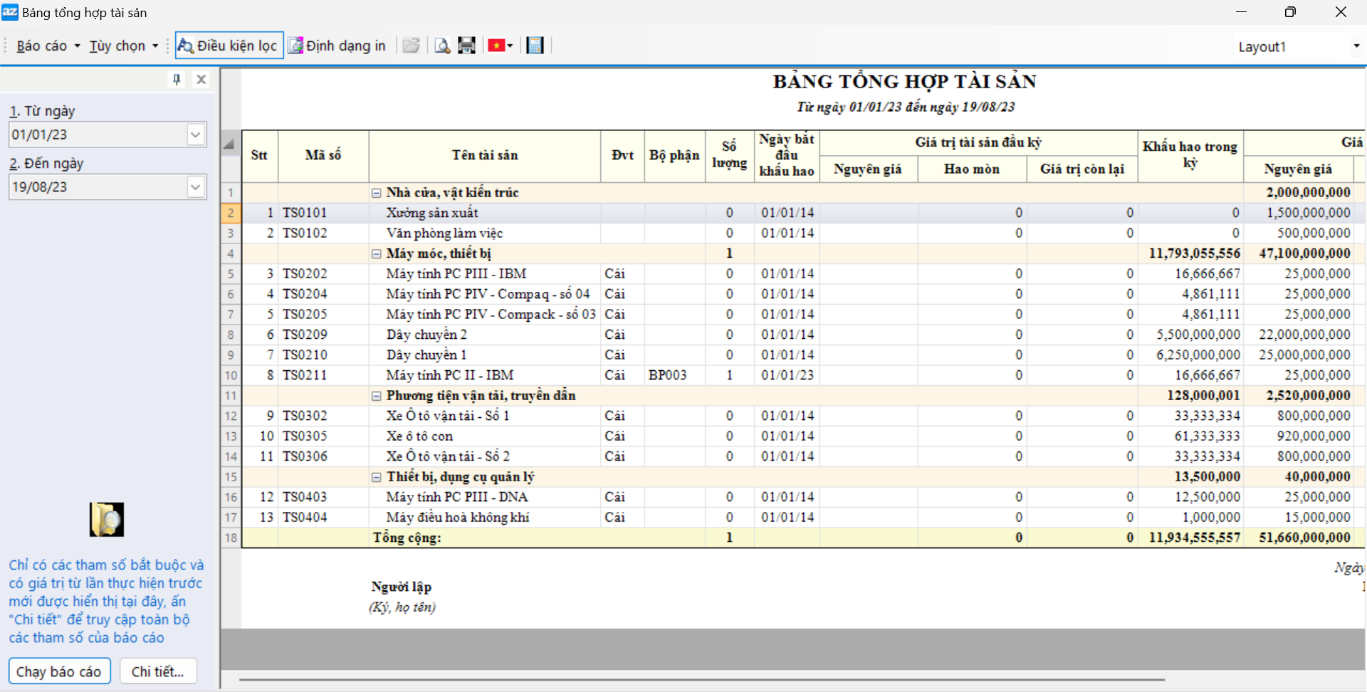 Người sử dụng có thể truy cập các báo cáo liên quan đến tài sản cố định từ menu “Bao cao\Báo cáo tài sản cố định - công cụ, dụng cụ”